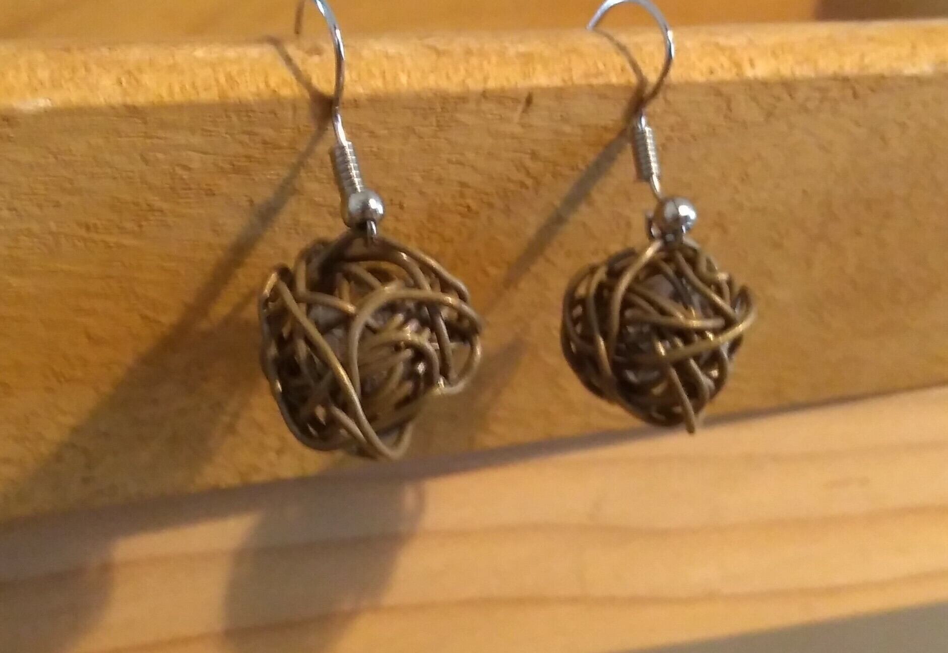 ブロンズの針金を透明なビーズをいれてぐるぐるまいたピアスです。